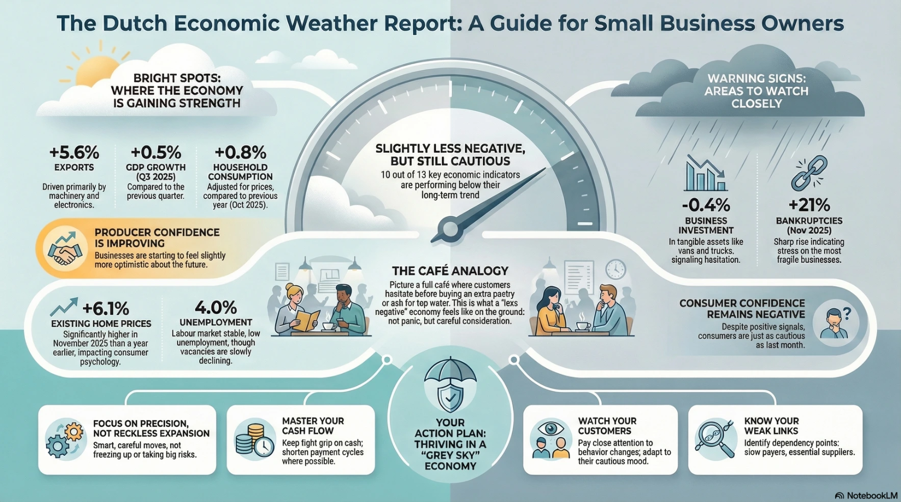 CBS’s latest Business Cycle Tracer was slightly less negative in December than in November, but the broader picture remains cautious. Ten of the thirteen indicators are still below their long-term trend. That is not a crisis signal, but it is not a comfortable tailwind either. It is a reminder that the Dutch economy is moving forward with some resistance.