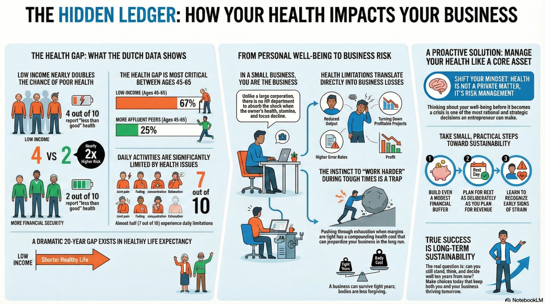 Most entrepreneurs recognise financial stress when it hits the bank account. Fewer recognise it when it shows up as fatigue, chronic pain, or a lingering sense that work takes more effort than it used to. Yet the latest figures from Statistics Netherlands tell a story that many small business owners will recognise instantly, even if they have never seen it written down.