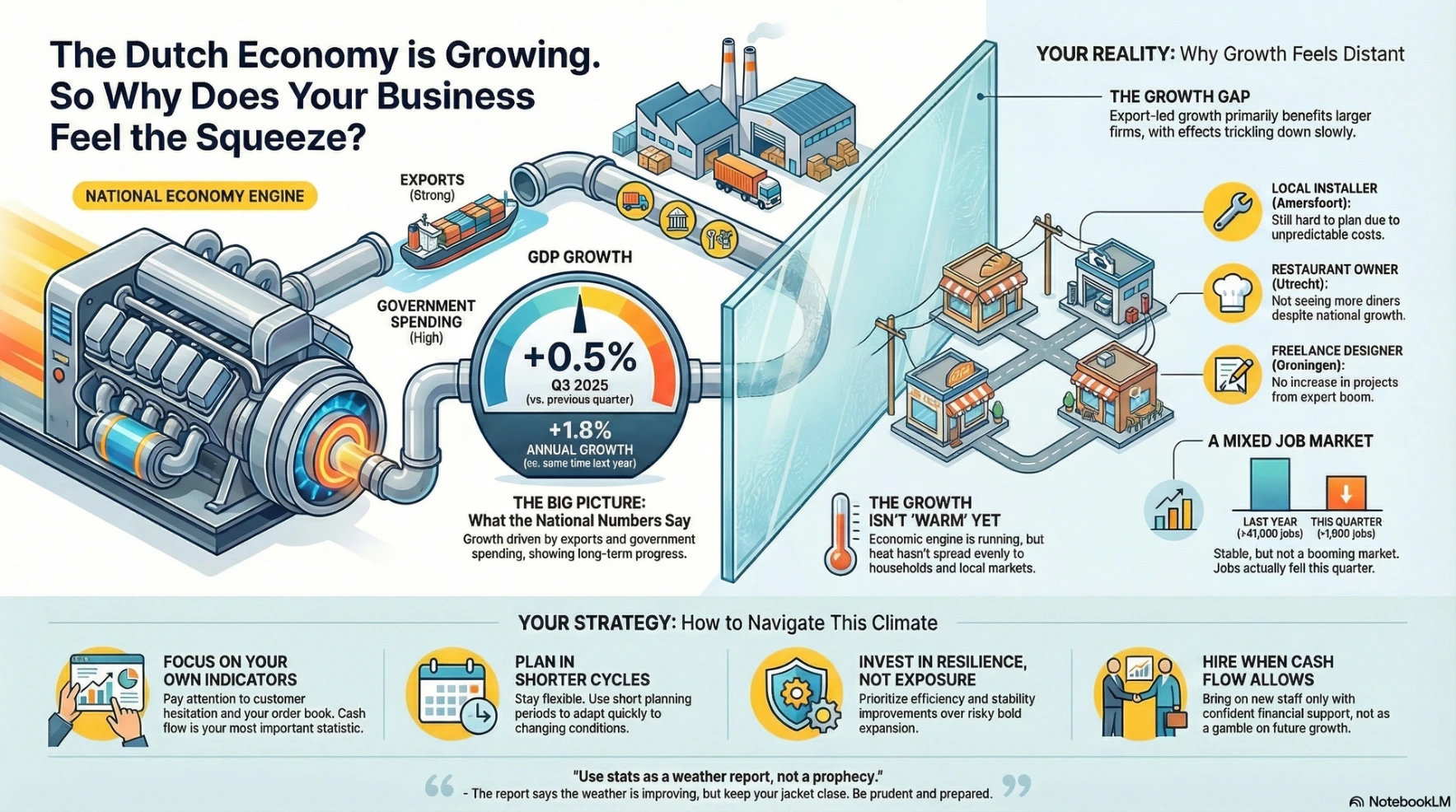 The Dutch economy is growing, and that matters. But growth is not the same thing as relief, and it is not the same thing as certainty. Micro and small businesses live in the space between those words. The country can be moving forward while you still feel the friction in the gears. The most useful outcome of this GDP update is not the number itself, but the reminder it offers: the economy is improving gradually, and that gradualness is exactly why clear thinking, disciplined planning, and modest adjustments remain more valuable than bold moves.