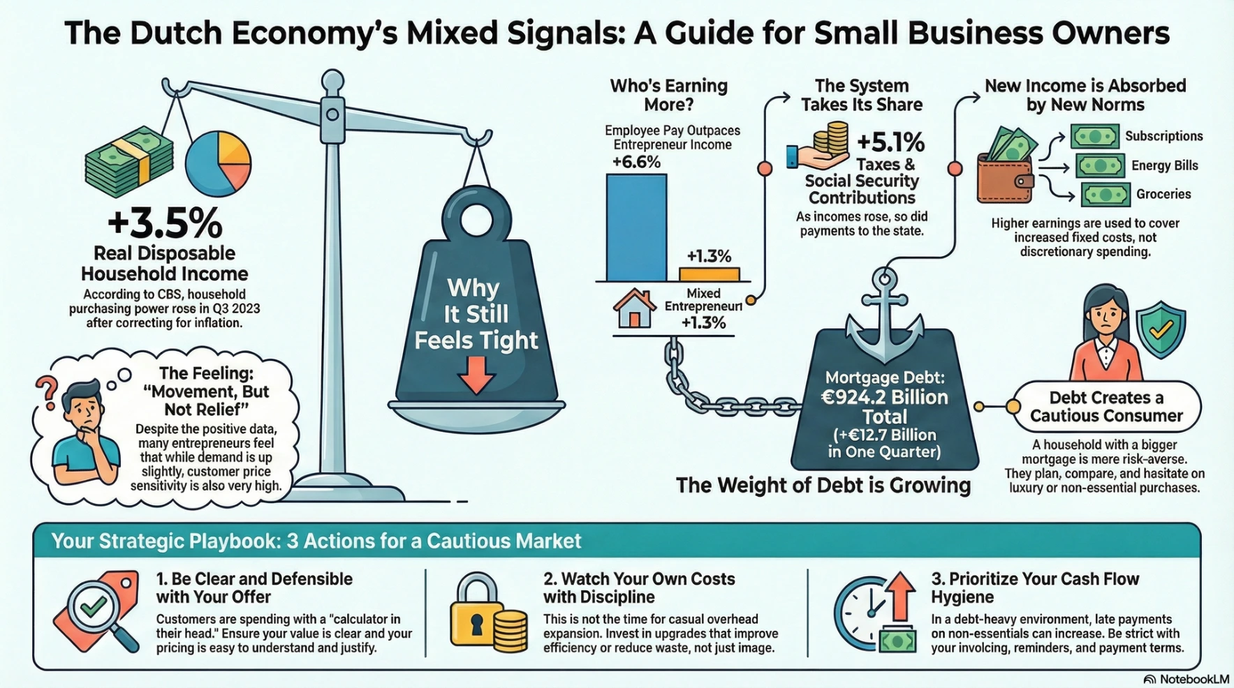 When Statistics Netherlands (CBS) says that real disposable household income rose by 3.5 percent in the third quarter of 2025 compared to a year earlier, it sounds like a quiet victory. “Real” means corrected for price increases, so it is not just people earning more, it is people actually keeping more purchasing power. In a country where micro and small businesses live in close contact with consumer confidence, that number should matter. Yet many entrepreneurs I meet do not feel a sudden easing of the week. They feel movement, yes, but not relief. And that difference between what the data says and what daily life feels like is where the real story sits.