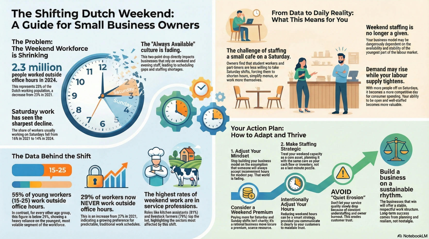 If you run a micro or small business, you already feel this shift without needing a report to confirm it. Let me give you one concrete scene. Imagine a small independent café in Amersfoort, run by a couple who built their reputation on Saturday mornings. For years, Saturdays were not optional; they were the financial backbone. But now the owner notices something subtle: the student who used to pick up an extra Saturday shift suddenly prefers weekday evenings. Another part-timer asks for Saturdays off because of study pressure, travel, or simply because they want a predictable life. The café can still open, but the owner starts shortening hours, simplifying the menu, or doing more shifts personally. None of this is dramatic, but it changes the economics. It changes the stress level. And it changes how the business must plan its week.
