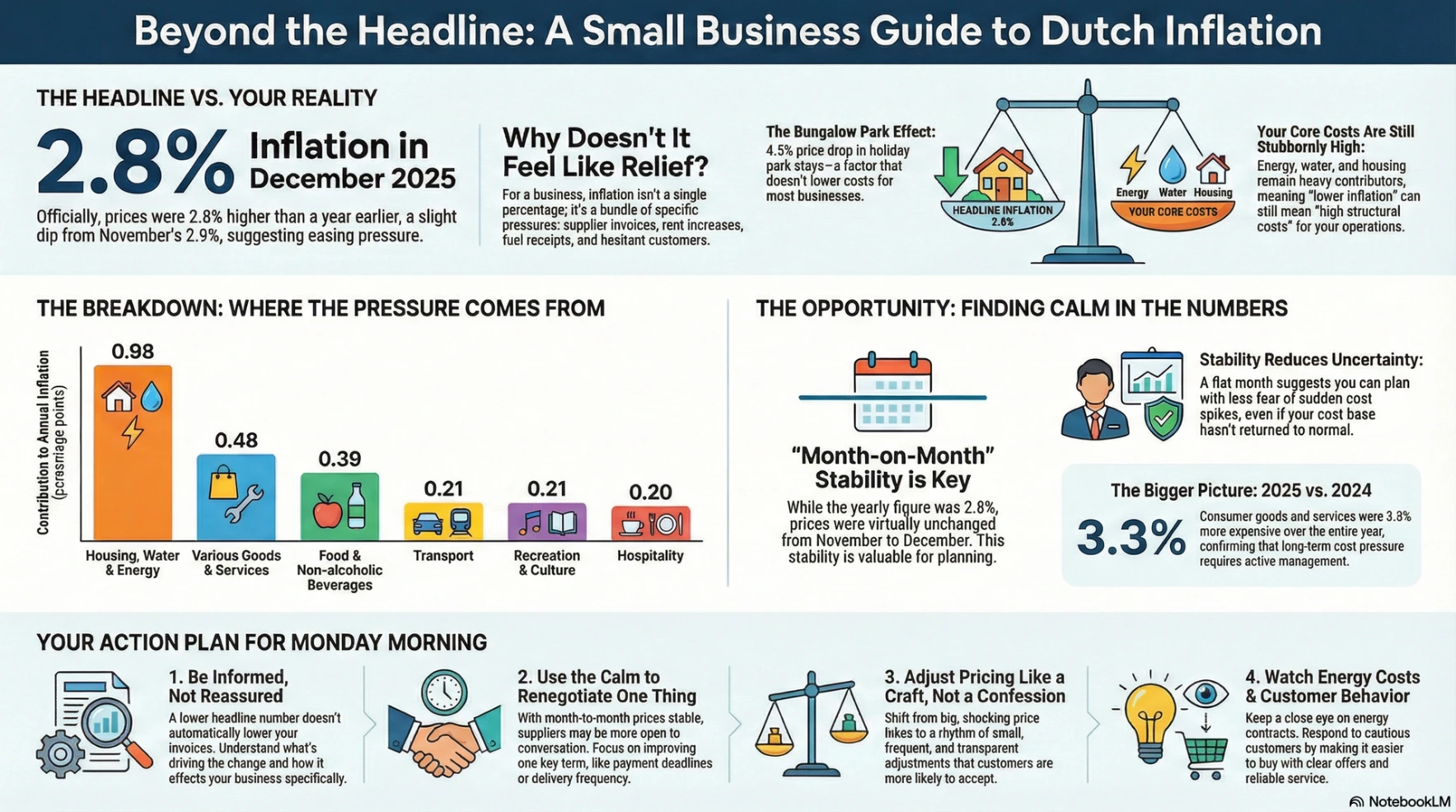 Let me anchor this in a scene I have watched play out more than once. A small catering business in Utrecht, five people, loyal clients, good reputation. The owner reviews the year-end figures and feels a hint of optimism when she hears “inflation down”. Then she looks at her own ledger: electricity still hurts, packaging costs have not come back down, and one key supplier has quietly tightened payment terms. Customers are still booking, but they ask more questions, compare more offers, and postpone decisions until the last possible moment. Her world does not feel like 2.8 percent. It feels like friction. That is the point: inflation is not one pressure, it is a bundle of pressures, and your business only meets the parts that touch your operations.